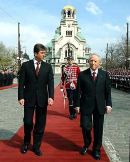 Il Presidente Ciampi accolto dal Presidente della Repubblica di Bulgaria, Georgi Parvanov, durante la cerimonia di benvenuto.