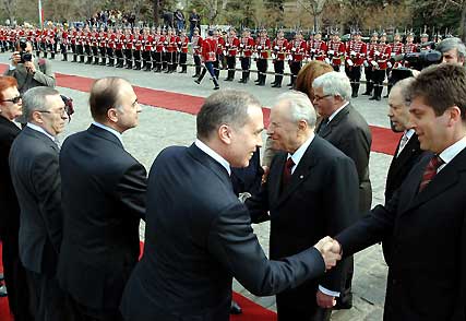 ll Presidente Ciampi, a fianco il Presidente Georgi Parvanov, saluta la delegazione di Bulgaria al termine della cerimonia di benvenuto.