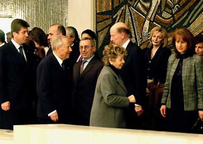 I Presidenti della Repubblica Italiana e di Bulgaria, Carlo Azeglio Ciampi e Georgi Parvanov con le rispettive Consorti ed il Primo Ministro Simeone di Sassonia-Coburgo Gotha, durante la cerimonia di inaugurazione della Mostra "Dove Roma incontra Sofia" .