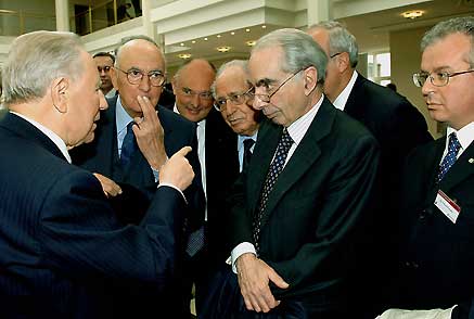 Una pausa dei lavori del convegno "Quale Europa vogliamo". Nella foto il Presidente Ciampi si intrattiene con Giorgio Napolitano, Rainer Masera, Antonio Maccanico, Giuliano Amato e Paolo Peluffo