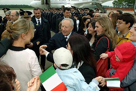 Il Presidente Ciampi al suo arrivo, all'Aeroporto di Geilenkirchen, accolto da una rappresentanza degli ufficiali italiani e delle loro famiglie, di stanza nella base NATO