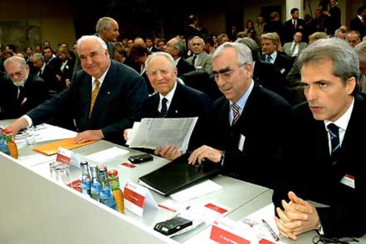 Un momento dei lavori del convegno "Quale Europa vogliamo". Nella foto da sin. Bronislaw Geremek, Helmut Kohl, Carlo Azeglio Ciampi, Theo Waigel e Sergio Balbinot