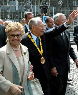 Il Presidente Ciampi con la moglie Franca, davanti al Duomo, risponde al saluto dei cittadini dopo aver ricevuto, nella Sala dell'Incoronazione, il Premio Internazionale Carlo Magno.