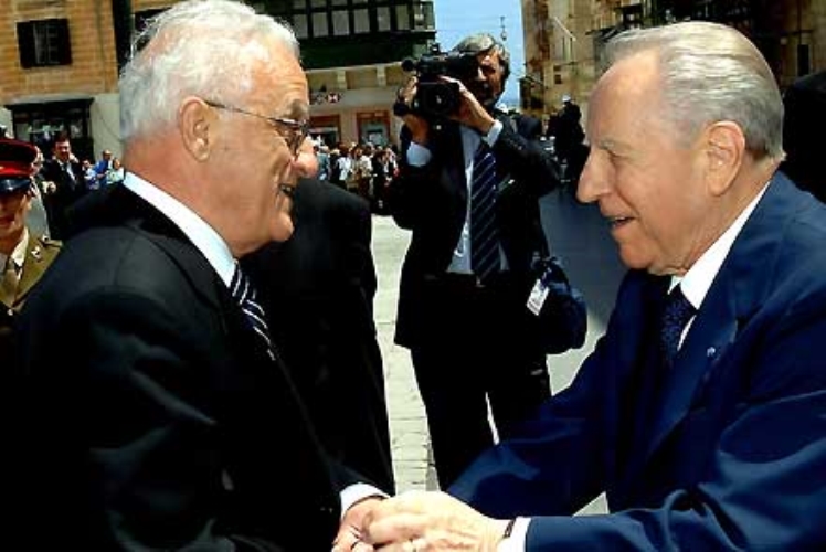 Il Presidente Ciampi accolto, dal Presidente della Repubblica di Malta Fenech Adami, in Piazza San Giorgio