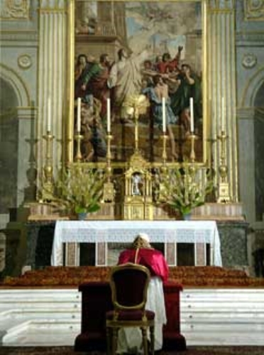 Il Santo Padre Benedetto XVI in preghiera nella Cappella Paolina,in occasione della visita ufficiale al Quirinale