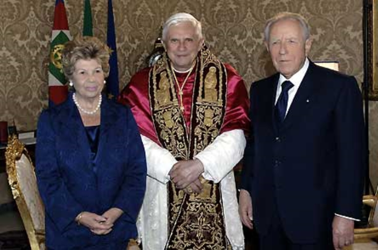 Il Presidente Ciampi con la moglie Franca e Sua Santità Benedetto XVI in occasione della visita ufficiale al Quirinale