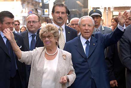 Il Presidente Ciampi, in compagnia della moglie Franca, risponde al saluto dei cittadini all'arrivo in Piazza Vittorio Emanuele