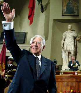Il Presidente Ciampi, nell'Aula Giulio Cesare in Campidoglio, risponde agli applausi dei presenti, al termine della cerimonia di conferimento della cittadinanza onoraria