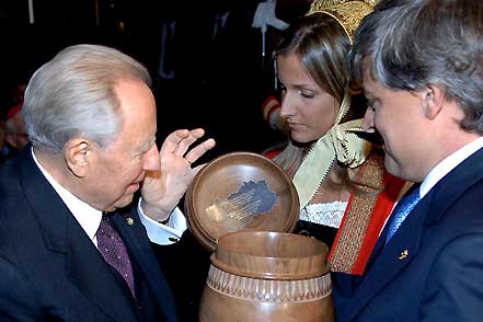 Il Presidente Ciampi al termine del suo intervento al Palazzo della Regione, riceve la "Grolla" dell'amicizia dal Presidente della Regione Autonoma Luciano Caveri