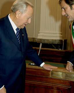 Il Presidente Ciampi osserva, nell'Aula del Consiglio comunale, il posto occopato da Quintino Sella e da Giuseppe Pella
