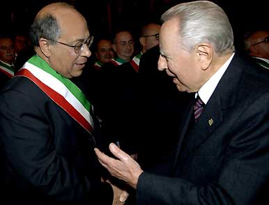Il Presidente Ciampi si intrattiene con il Sindaco di Tarano, Touhani Garnaoui, di origine tunisina, al termine dell'incontro con le Autorità al Teatro Flavio.