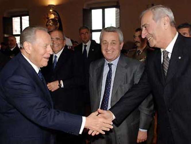 Il Presidente Ciampi al suo arrivo in Prefettura, saluta il Magnifico Rettore dell'Università "Carlo Bo" di Urbino, Giovanni Bogliolo.