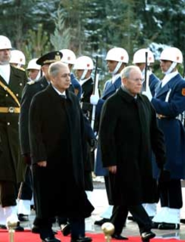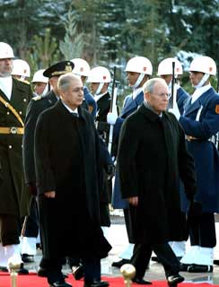Il Presidente Ciampi, accompagnato dal Presidente della Repubblica di Turchia Ahmet Necdet Sezer, riceve gli onori militari durante la cerimonia di benvenuto, a Palazzo Presidenziale.