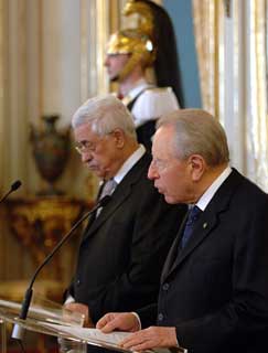 Il Presidente Ciampi con Abu Mazen, Presidente dell'Autorità Nazionale Palestinese, durante le comunicazioni alla stampa.