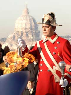 Un Guardaportone in divisa storica accende il braciere olimpico, in occasione della cerimonia ufficiale di inizio del Viaggio della Fiamma Olimpica in Italia.