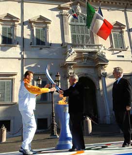 Il Presidente Ciampi consegna la Torcia olimpica al 1°tedoforo Stefano Baldini. A destra nella foto, Valentino Castellani, Presidente del Comitato Organizzatore Olimpico Torino 2006.