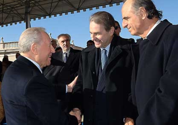 Il Presidente Ciampi saluta Jacques Rogge, Presidente del Comitato Olimpico Internazionale, in occasione della Cerimonia ufficiale di inizio della Fiamma Olimpica in Italia. A destra nelle foto: Mario Pescante, Sottosegretario Per i Beni e le Attività Culturali.