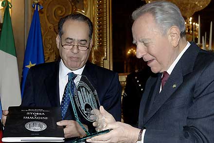 Il Presidente Ciampi con il Ministro dell'Interno Giuseppe Pisanu, osserva il "Logo" della Scuola Superiore dell'Aministrazione Civile dell'Interno, in occasione dei 25 anni di fondazione