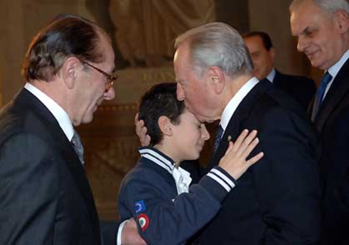Il Presidente Ciampi consegna la Medaglia d'Oro al Merito Civile alla memoria del Pilota Pier Paolo Racchetti al padre Pierluigi, in occasione degli auguri di Natale e Capodanno alle Magistrature della Repubblica.