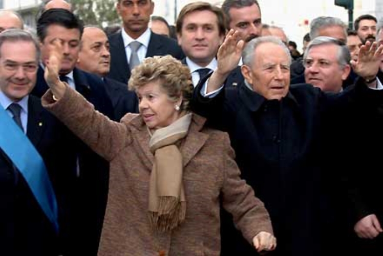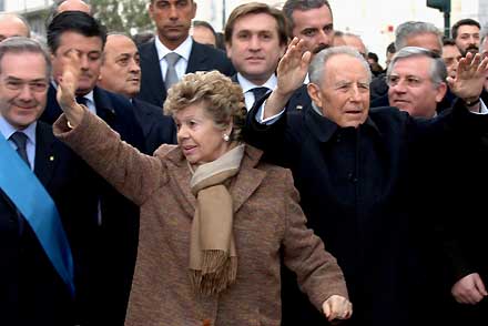 Il Presidente Ciampi in compagnia della moglie Franca, risponde al saluto dei cittadini all'arrivo alla Camera di Commercio