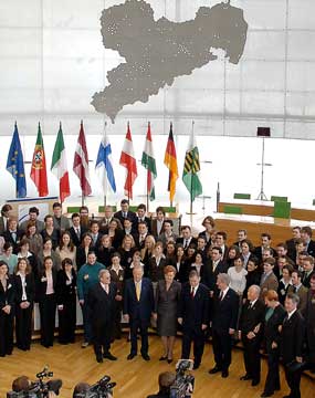 Foto dei Capi di Stato firmatari dell'articolo "Uniti per l'Europa" con gli studenti nella sede del Parlamento dello Stato Libero di Sassonia, in occasione dell'incontro.