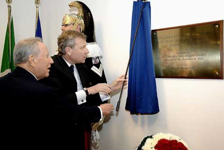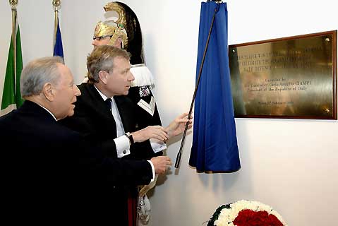 Il Presidente Ciampi con il Segretario Generale della Nato, Jaap de Hoo Scheffer, durante la cerimonia di scoprimento della targa intitolata al Presidente Ciampi in ricordo della cerimonia per i 40 anni dell'insediamento a Roma del NATO Defense College.