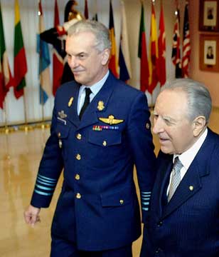 Il Presidente Ciampi, accompagnato dal Comandante del NATO Defense College, Marc Vankeirsbilck, durante la celebrazione dei 40 anni dell'insediamento a Roma.