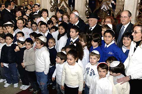 Il Presidente Ciampi, il Rabbino Emerito Elio Toaff ed il Presidente della Comunità Ebraica di Roma, Leone Paserman, posano per una foto ricordo con i bambini delle scuole della Comunità, in occasione della visita, in forma privata, al Museo Ebraico ed al Tempio Maggiore di Roma