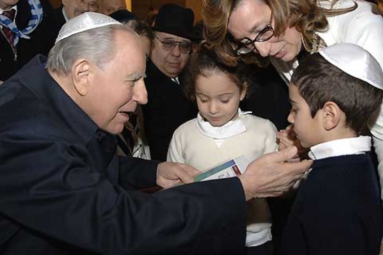 Il Presidente Ciampi, durante la visita in forma privata al Tempio Maggiore di Roma ed al rinnovato Museo Ebraico, riceve il benvenuto da parte di due bambini della Comunità