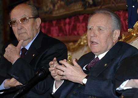 Il Presidente Ciampi con a fianco il Cav. Gr. Croce Gerardo Agostini, Presidente della Confederazione Italiana fra le Associazioni combattentistiche e Partigiane, saluta i Presidenti delle Associazioni aderenti al sodalizio.