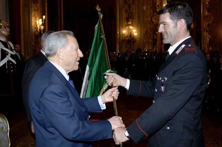 Il Presidente Ciampi prende in consegna la Bandiera nazionale dalle mani di Armin Zoeggeler, Alfiere della squadra italiana.
