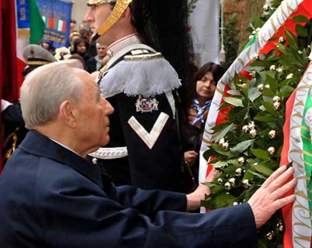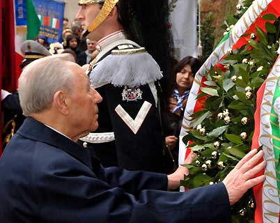 Il Presidente Ciampi depone una corona di alloro sulla lapide posta all'ingresso delle Cave Ardeatine, in occasione della cerimonia commemorativa del 62° anniversario dell'eccidio delle Fosse Ardeatine.