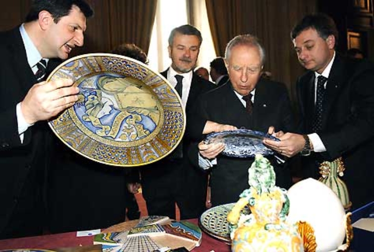 Il Presidente Ciampi nella foto con Stefano Collina, Presidente dell'Associazione Italiana dela Ceramica, Ivan Malavasi, Presidente della CNA e della Piccola e Media Impresa e Giorgio Guerrini, Presidente della Confartigianato.
