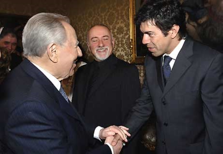 Il Presidente Ciampi, nella foto con Pierfrancesco Favino e Giorgio Faletti, in occasione dell'incontro con i candidati ai Premi David di Donatello 2006.