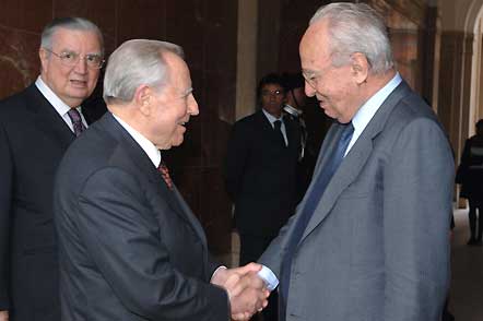 Il Presidente Ciampi, al termine della seduta del Consiglio Superiore della Magistratura per l'elezione del nuovo Procuratore Generale presso la Corte Suprema di Cassazione, saluta il Vice Presidente del CSM Virginio Rognoni, al Palazzo dei Marescialli. Nella foto, alla sinistra, il Segretario Generale della Presidenza della Repubblica Dott. Gaetano Gifuni