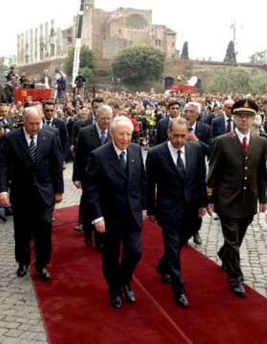 Il Presidente Ciampi accompagnato dal Ministro dell'Interno Giuseppe Pisanu, al suo arrivo sul piazzale del Colosseo per assistere alla rassegna del Corpo Nazionale dei Vigili del Fuoco.