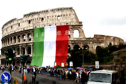Un grande Tricolore fatto scendere dall'alto del Colosseo, in occasione dell'anniversario del Corpo dei Vigili del Fuoco, presente il Presidente Ciampi.