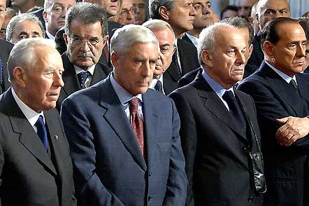 Il Presidente Ciampi durante i funerali delle vittime di Nassiriya. Nella foto con Marini, Bertinotti, Berlusconi e Prodi.
