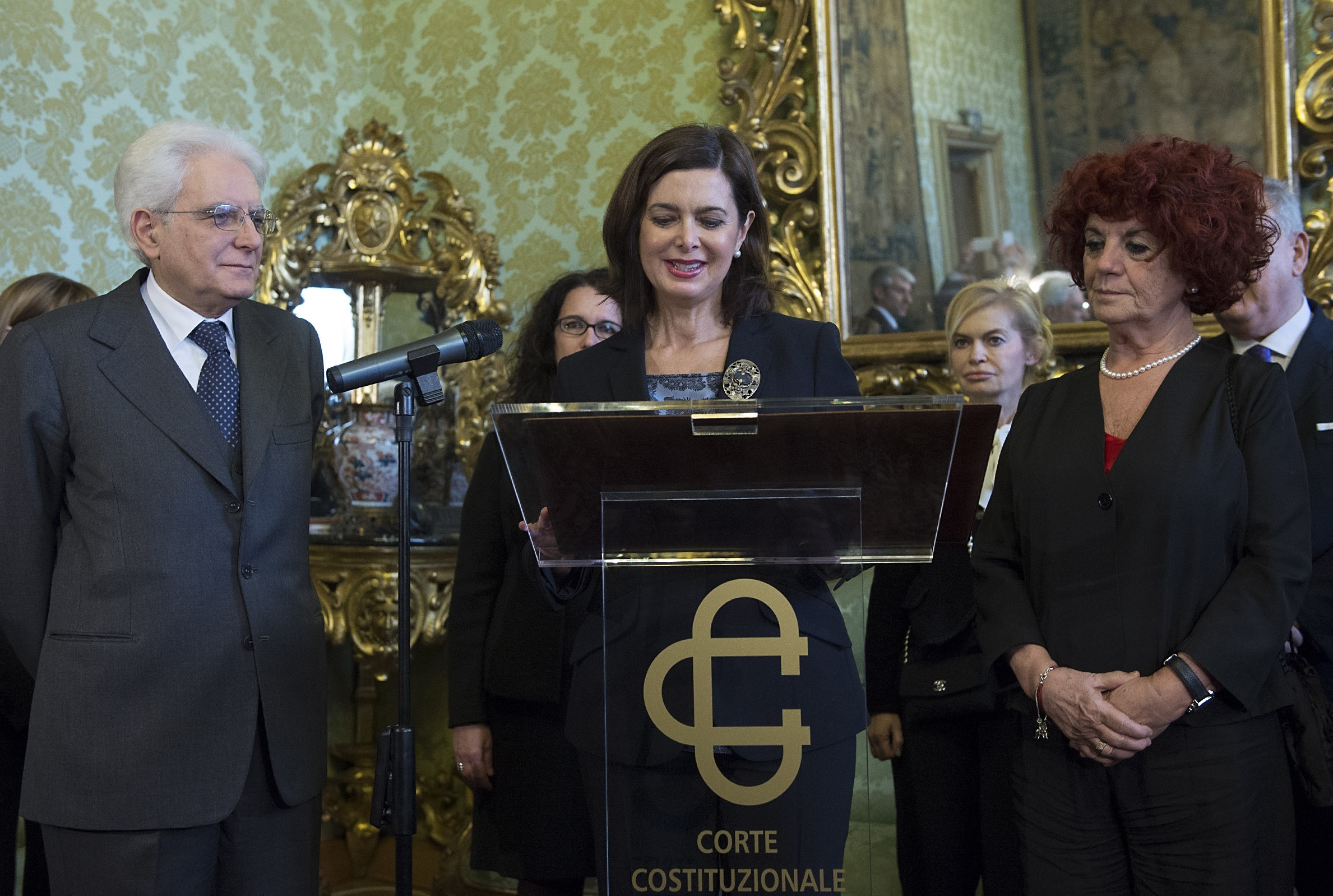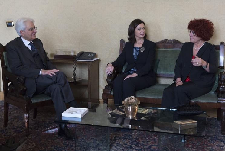Il neo eletto Presidente della Repubblica, Sergio Mattarella, con la Presidente della Camera, Laura Boldrini, e la Presidente Vicaria del Senato, Valeria Fedeli, in occasione della comunicazione ufficiale della elezione a Presidente della Repubblica