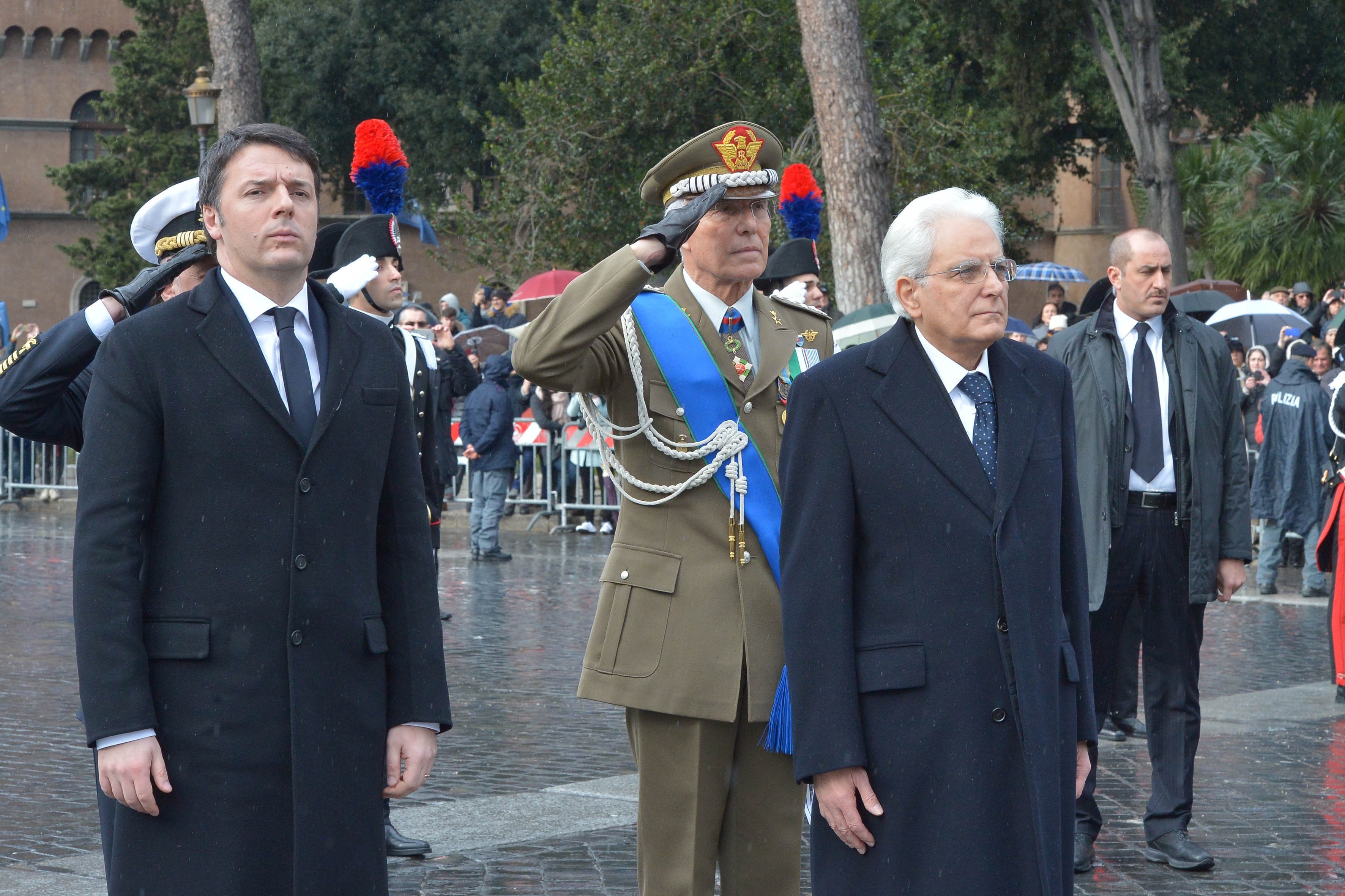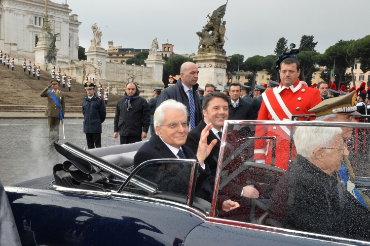 Il Presidente della Repubblica Sergio Mattarella lascia il Vittoriano dopo aver deposto una corona d'alloro sulla Tomba del Milite Ignoto