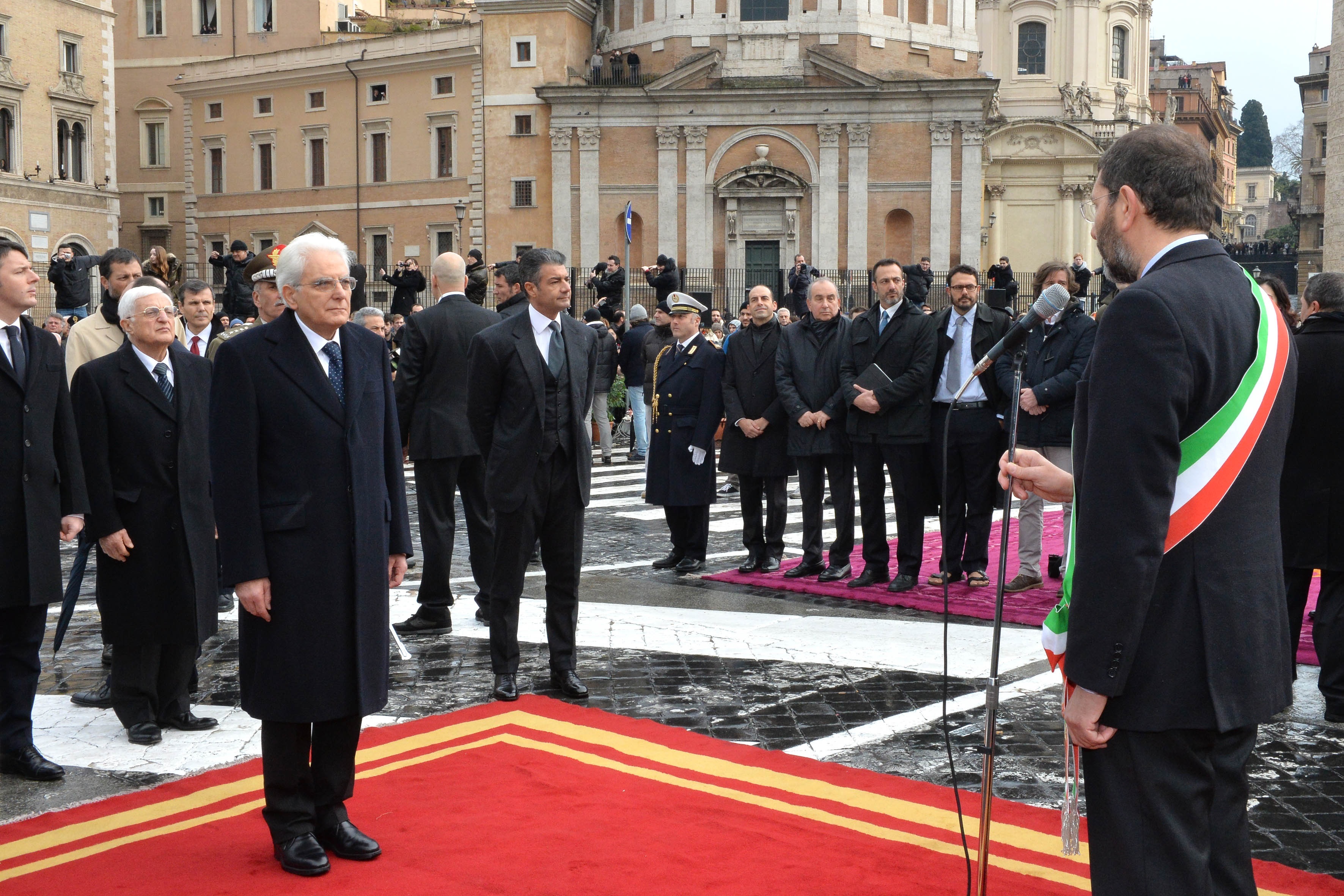Il Presidente della Repubblica Sergio Mattarella riceve il saluto dal Sindaco di Roma On. Prof. Ignazio Marino dopo aver deposto una corona d'alloro sulla Tomba del Milite Ignoto