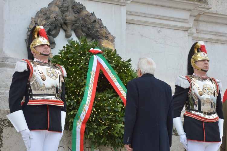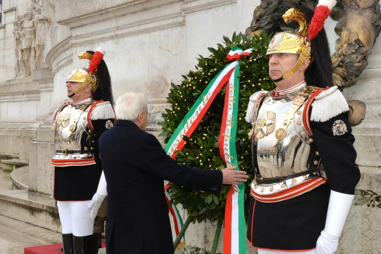 Il Presidente della Repubblica Sergio Mattarella nel corso della deposizione di una corona d'alloro sulla Tomba del Milite Ignoto