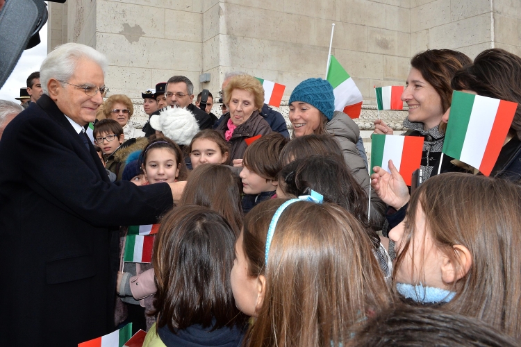 Il Presidente Sergio Mattarella saluta una scolaresca italiana che ha assistito alla cerimonia di deposizione di una corona d'alloro all'Arco di Trionfo
