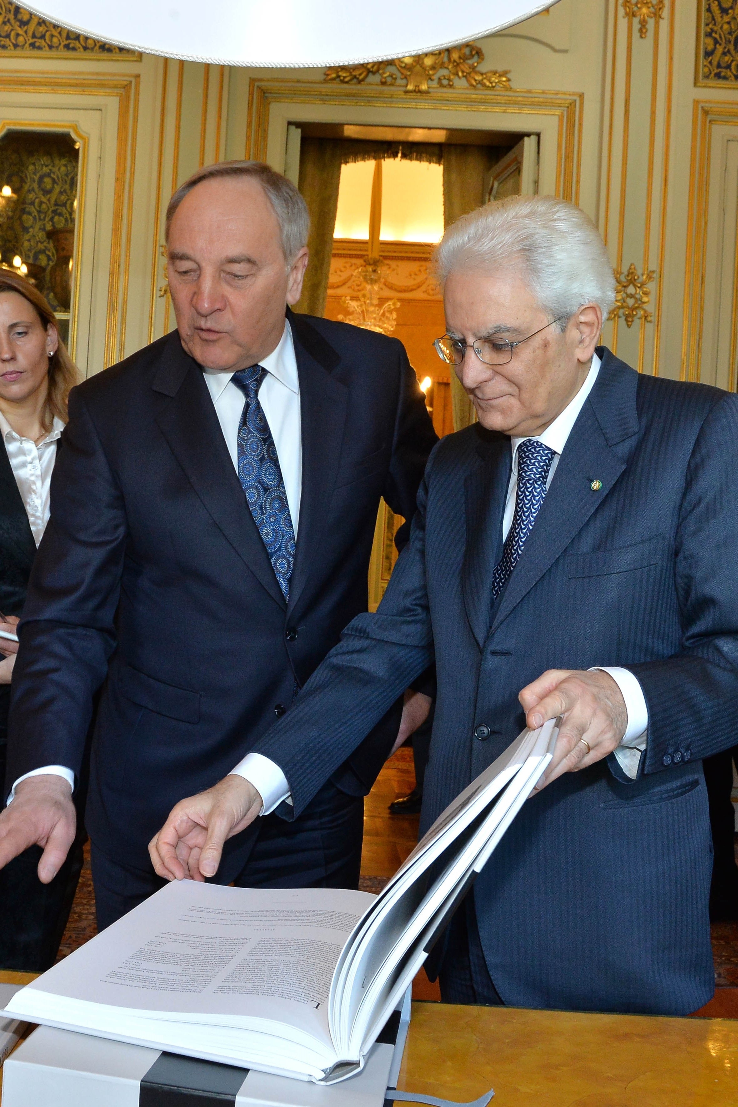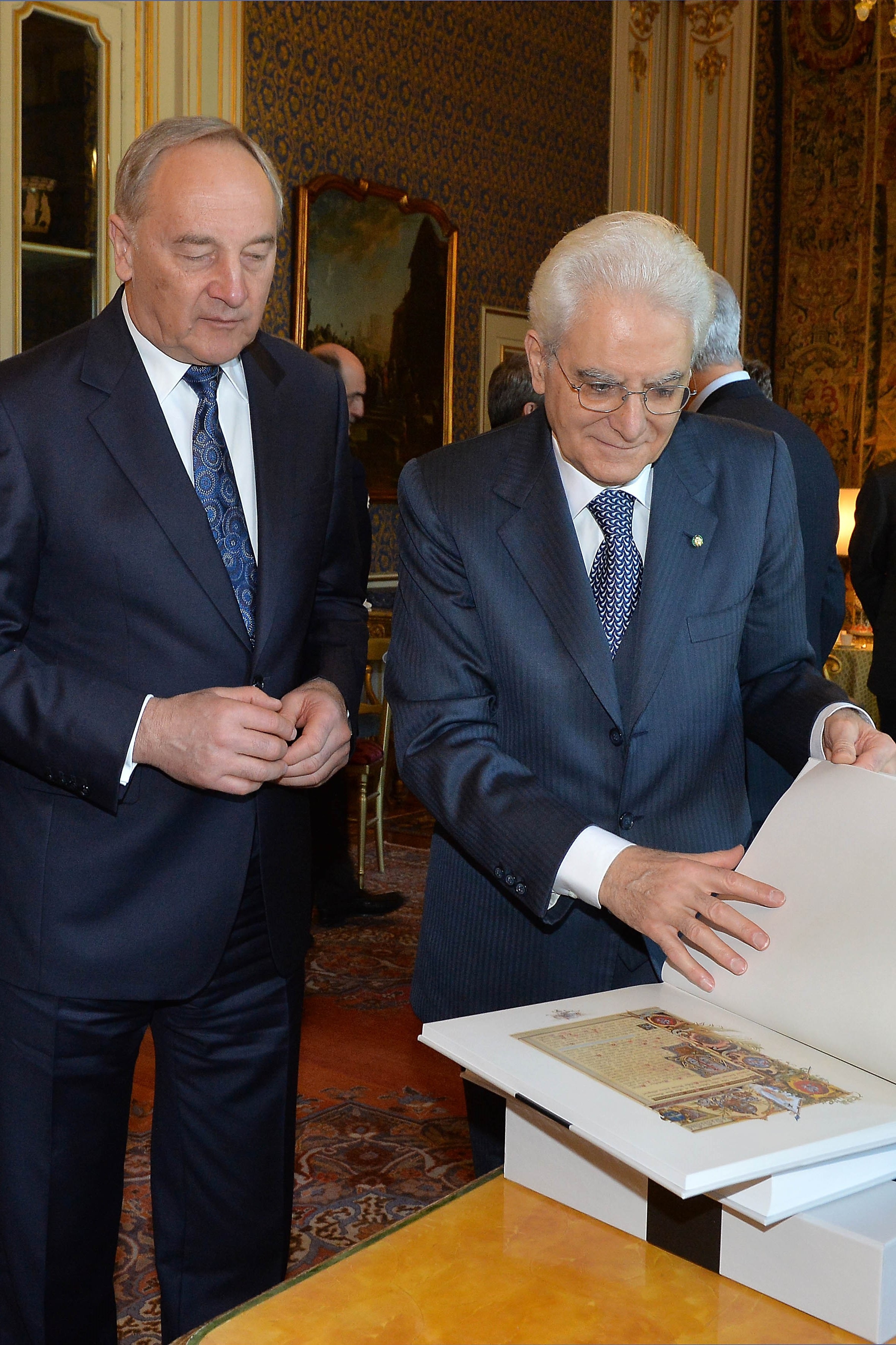 Il Presidente Sergio Mattarella riceve in dono un libro dal Presidente della Repubblica di Lettonia Andris Bērziņš