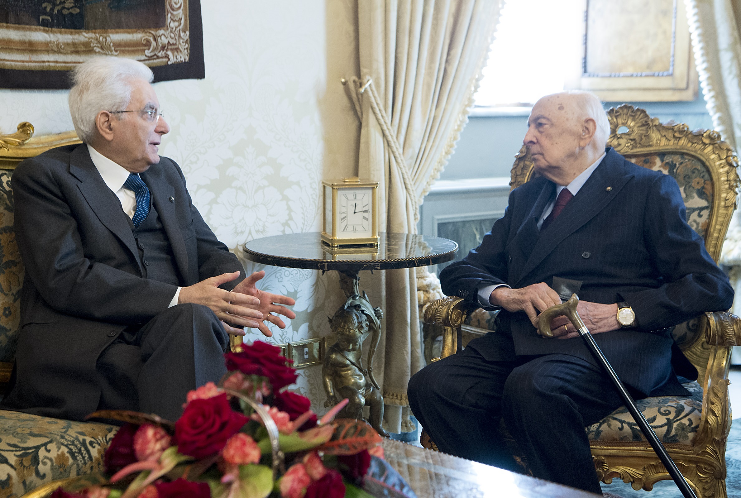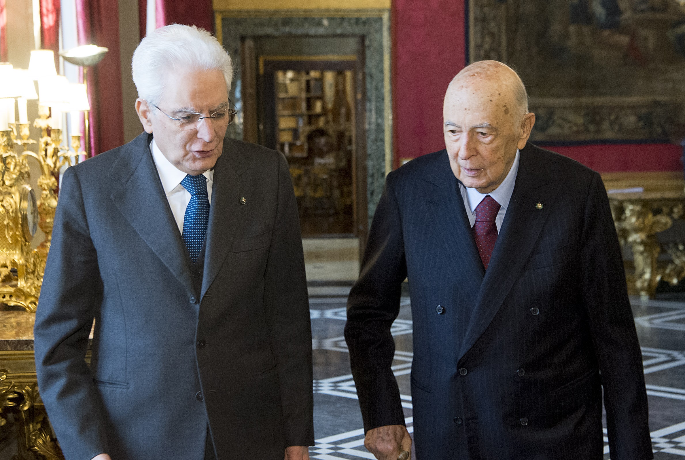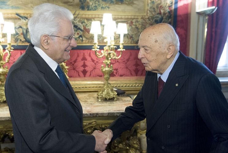 Il Presidente della Repubblica Sergio Mattarella con il Presidente emerito, senatore di diritto e a vita, Giorgio Napolitano, in occasione delle consultazioni