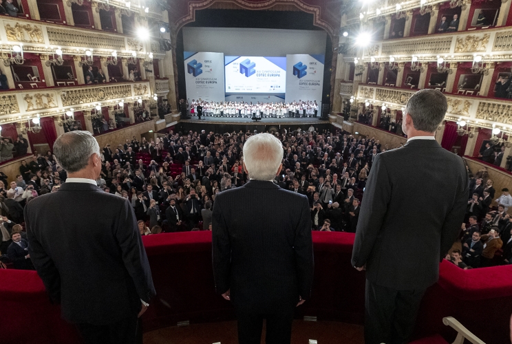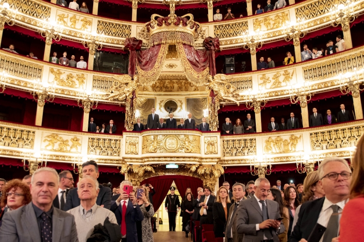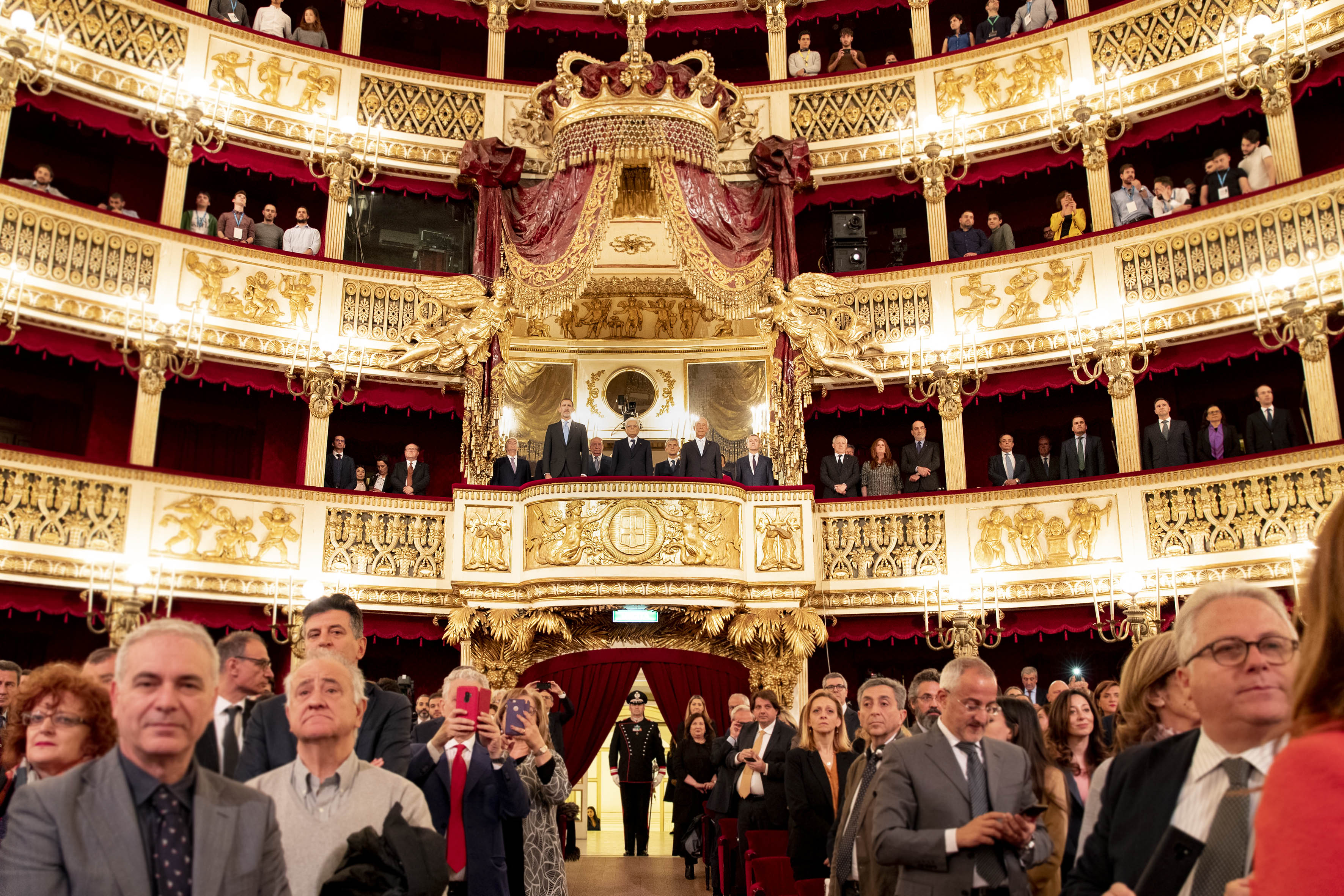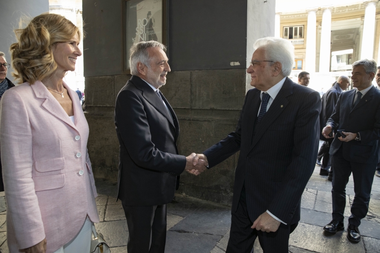 Il Presidente della Repubblica Sergio Mattarella a Napoli al Teatro San Carlo accolto da Luigi Nicolais, Presidente della Fondazione COTEC Italia e Isabel Furtado, Presidente della Fondazione COTEC Portogallo, in occasione del XIII Simposio COTEC