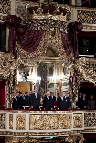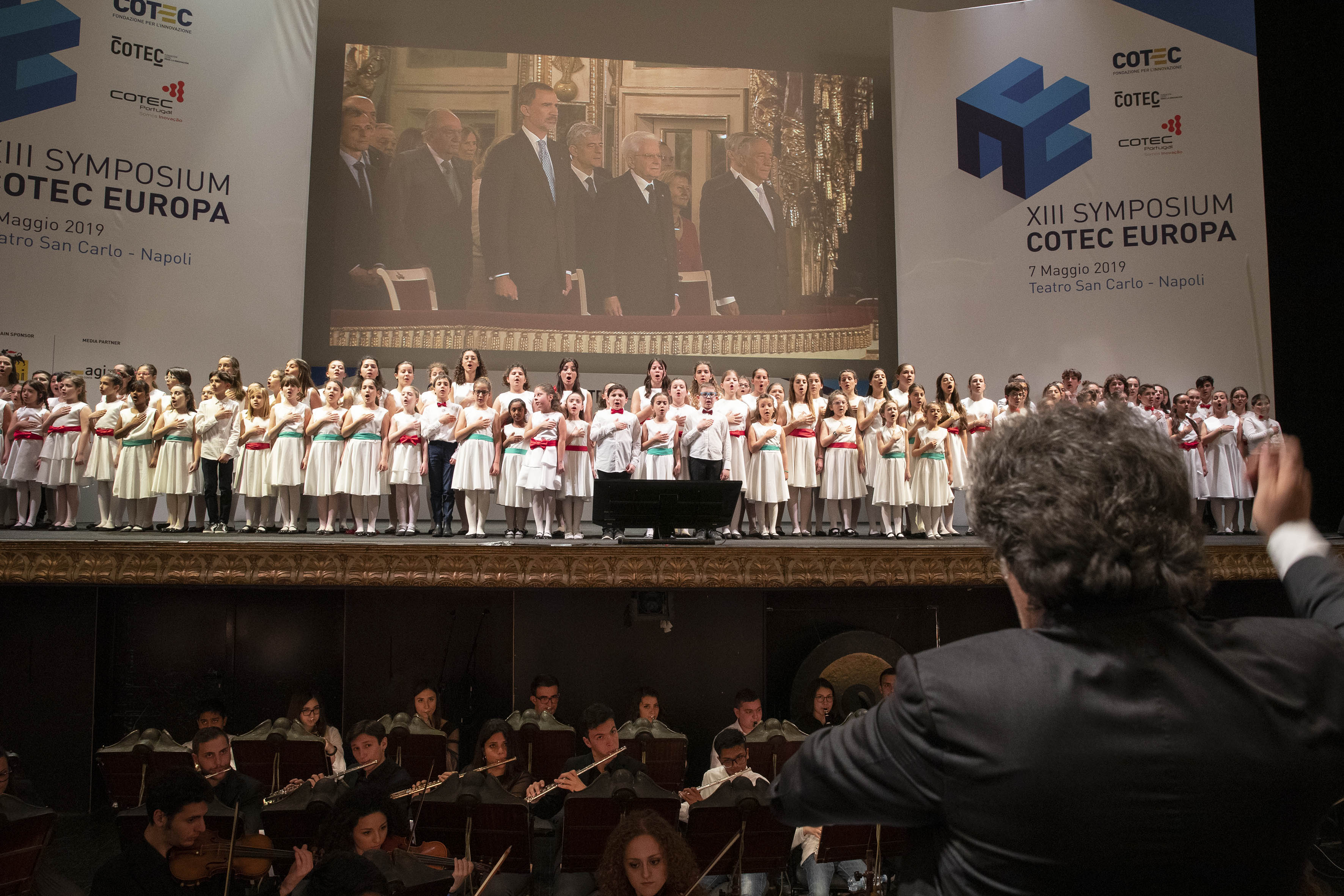 Il Presidente della Repubblica Sergio Mattarella a Napoli al Teatro San Carlo accolto da Luigi Nicolais, Presidente della Fondazione COTEC Italia, Isabel Furtado, Presidente della Fondazione COTEC Portogallo e Cristina Garmendia, Presidente della Fondazione COTEC Spagna,in occasione del XIII Simposio COTEC