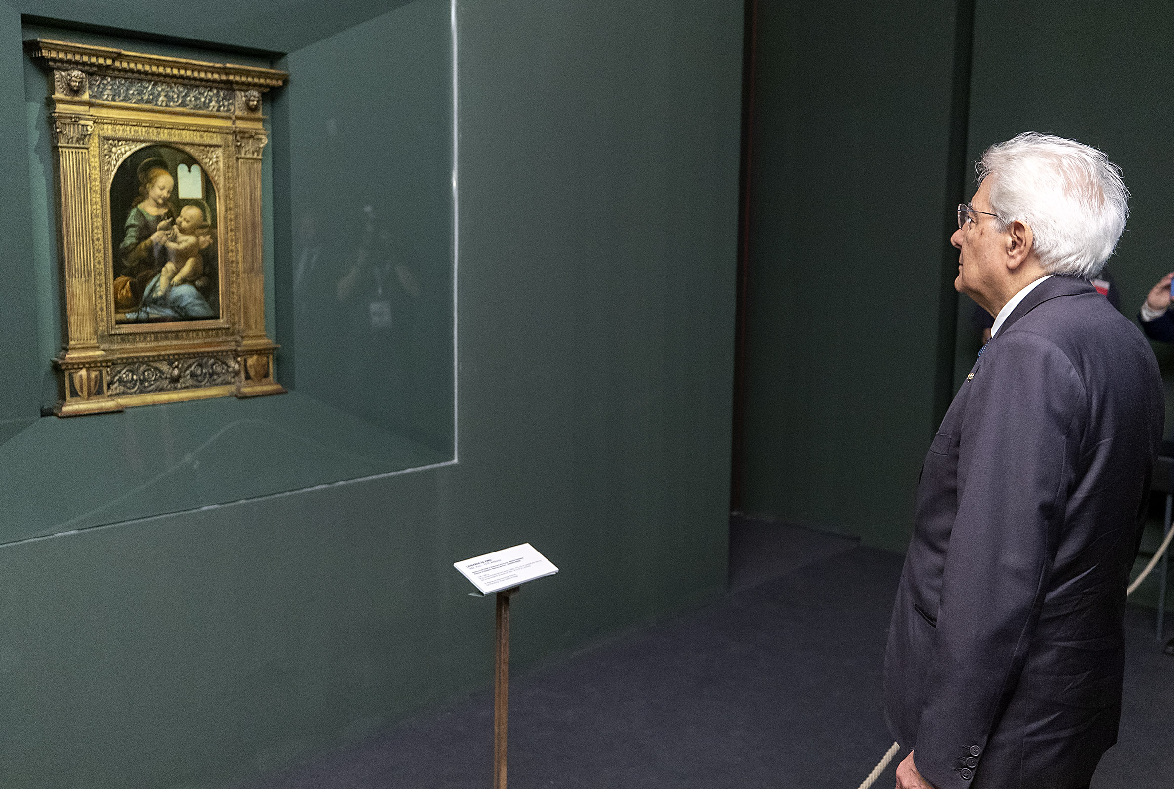 Il Presidente della Repubblica Sergio Mattarella osserva la Madonna Benois di Leonardo da Vinci esposta alla Pinacoteca Civica