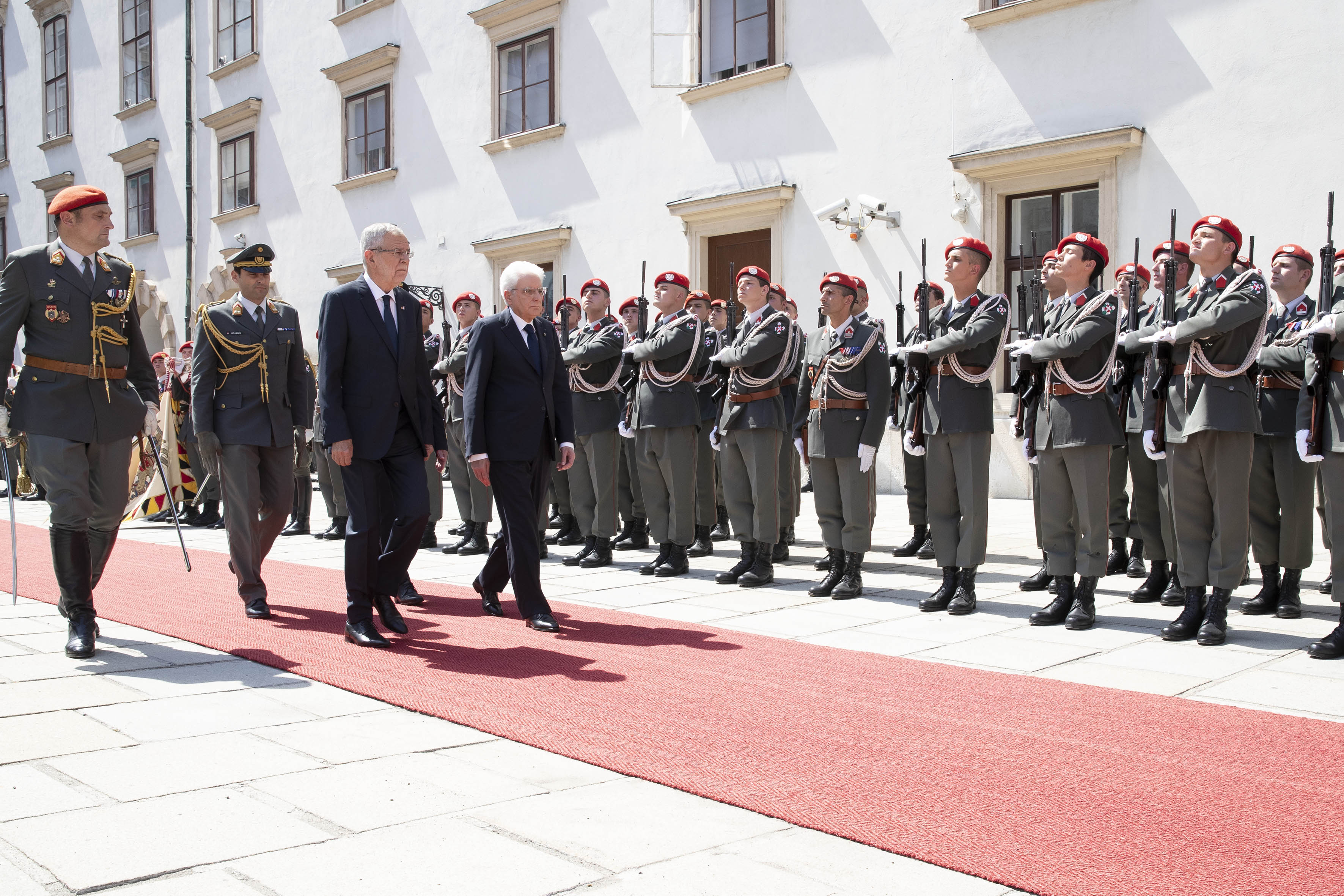 Il Presidente Sergio Mattarella con il Presidente Federale della Repubblica d'Austria Alexander Van der Bellen,durante gli onori militari,in occasione della visita di Stato nella Repubblica d'Austria