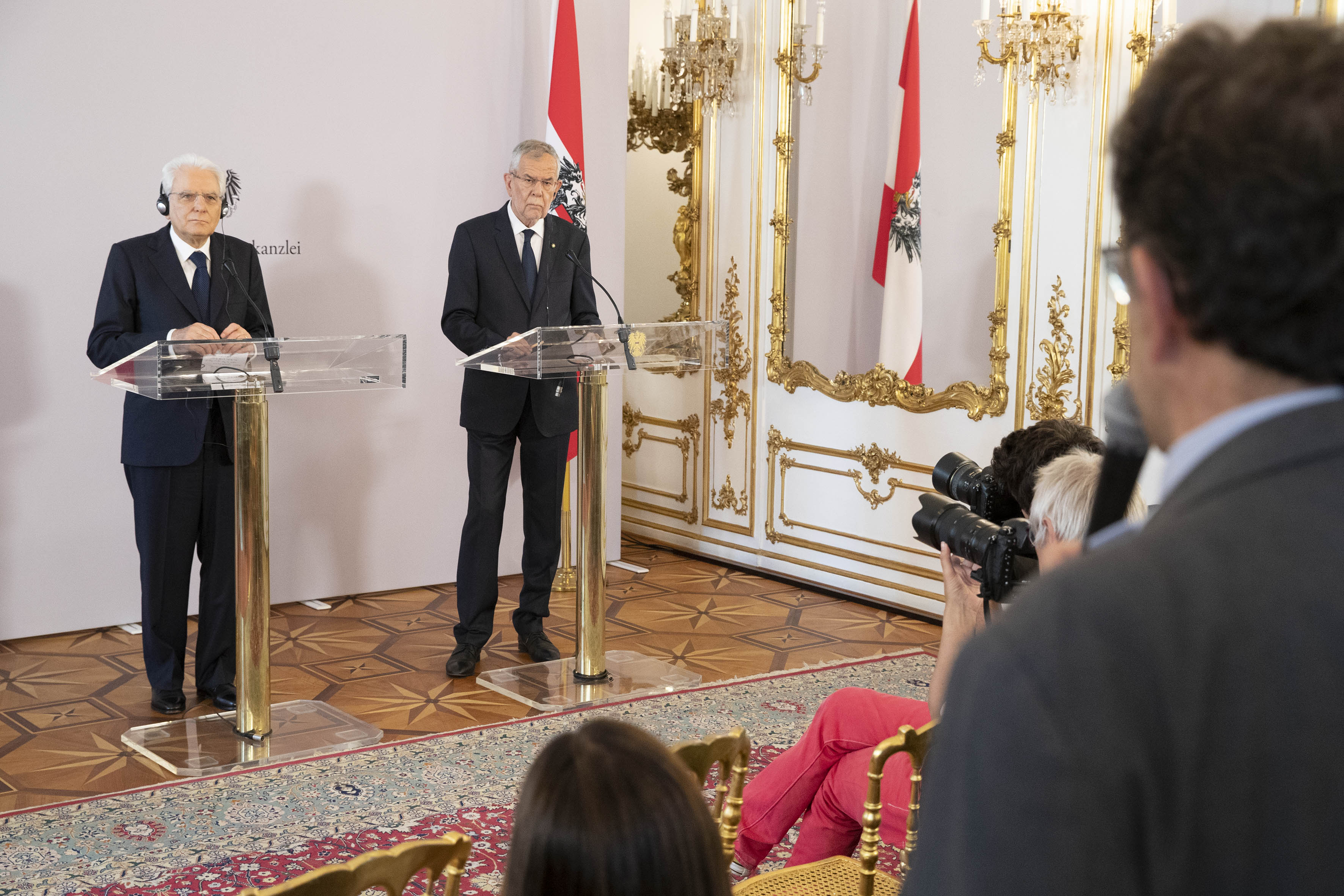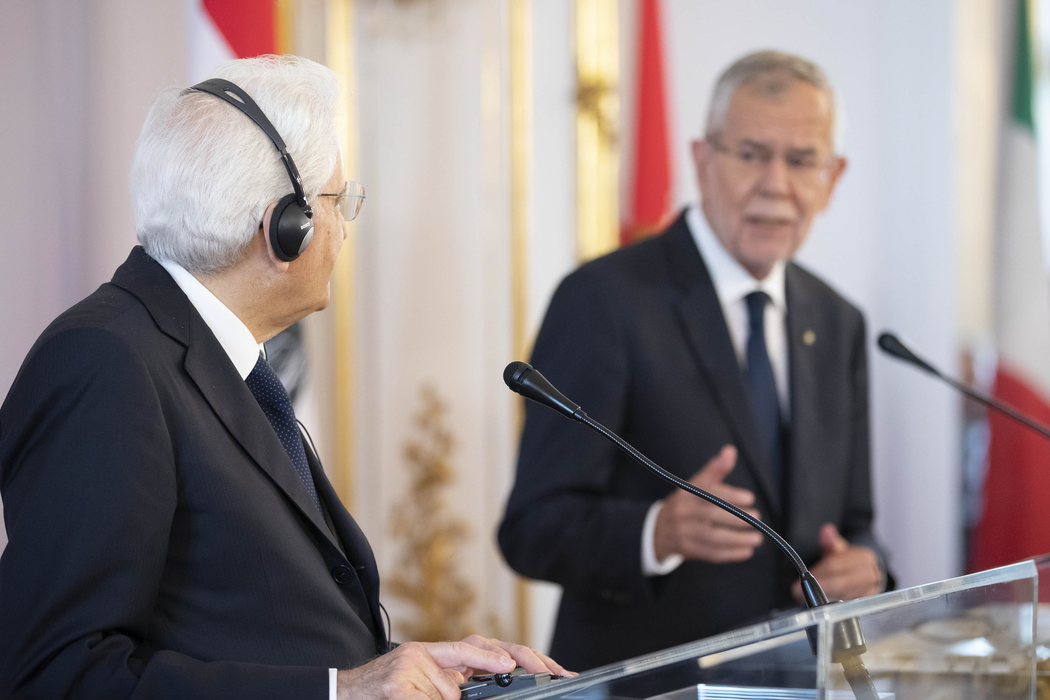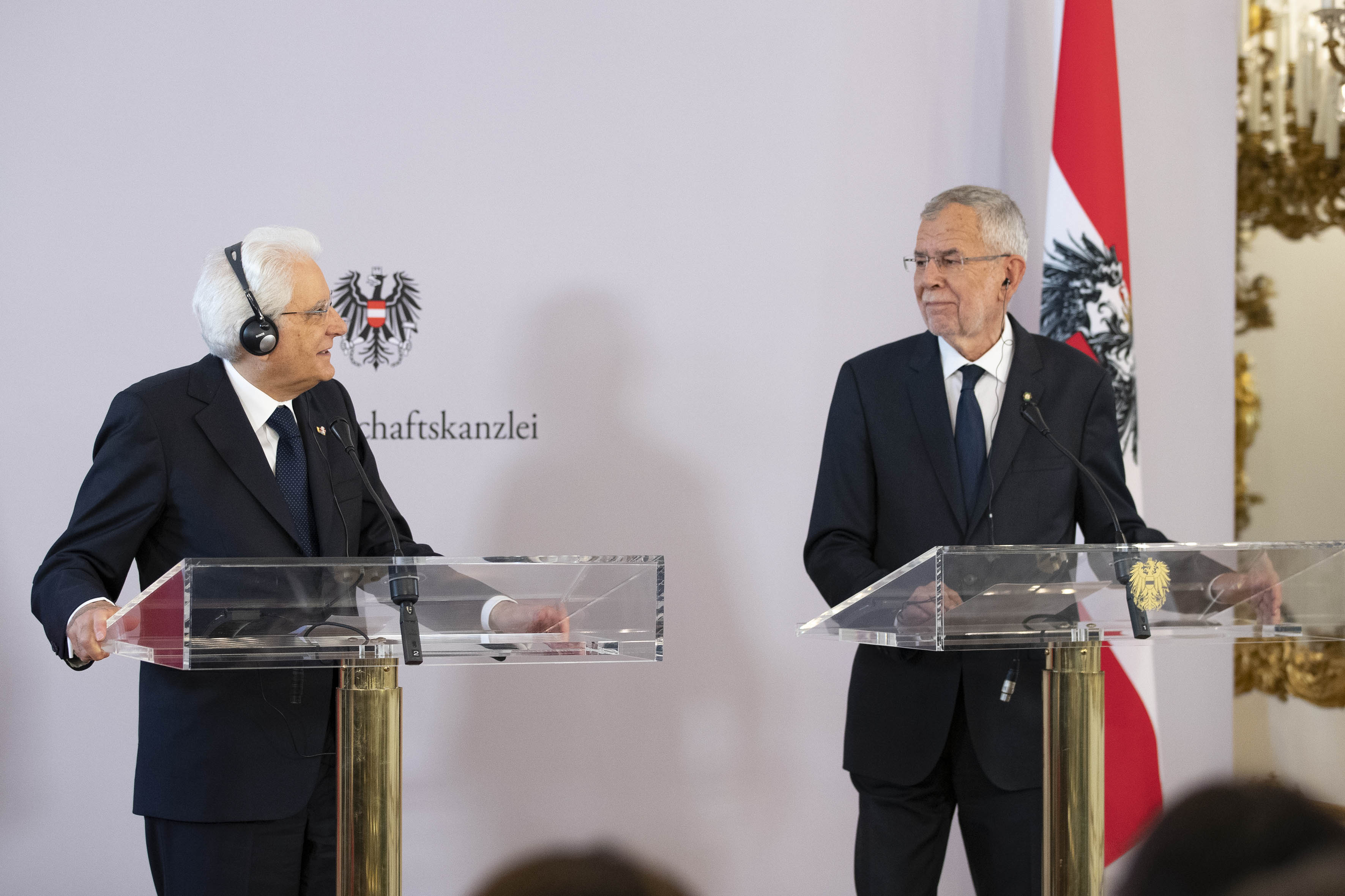 Il Presidente Sergio Mattarella con il Presidente Federale della Repubblica d'Austria Alexander Van der Bellen,durante le dichiarazioni alla stampa,in occasione della visita di Stato nella Repubblica d'Austria